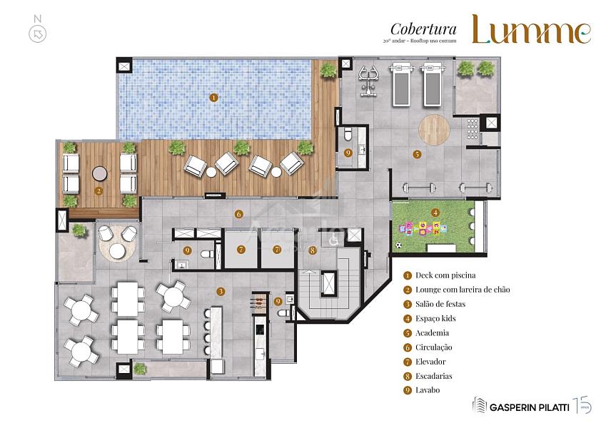 Um dos diferenciais do Lumme será a cobertura rooftop, que proporciona novos ângulos para apreciar Torres, sendo um espaço ideal para relaxamento e convívio social, com piscina de borda infinita, salão de festas, lounge externo com lareira de chão, espaço kids e espaço fitness.