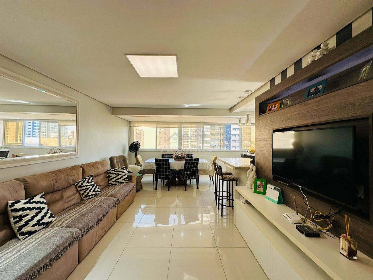 O living integrado une sala de estar e jantar de forma harmoniosa, conectado à cozinha americana e ao espaço gourmet com churrasqueira — ideal para receber amigos e aproveitar momentos especiais com uma bela vista ao fundo.